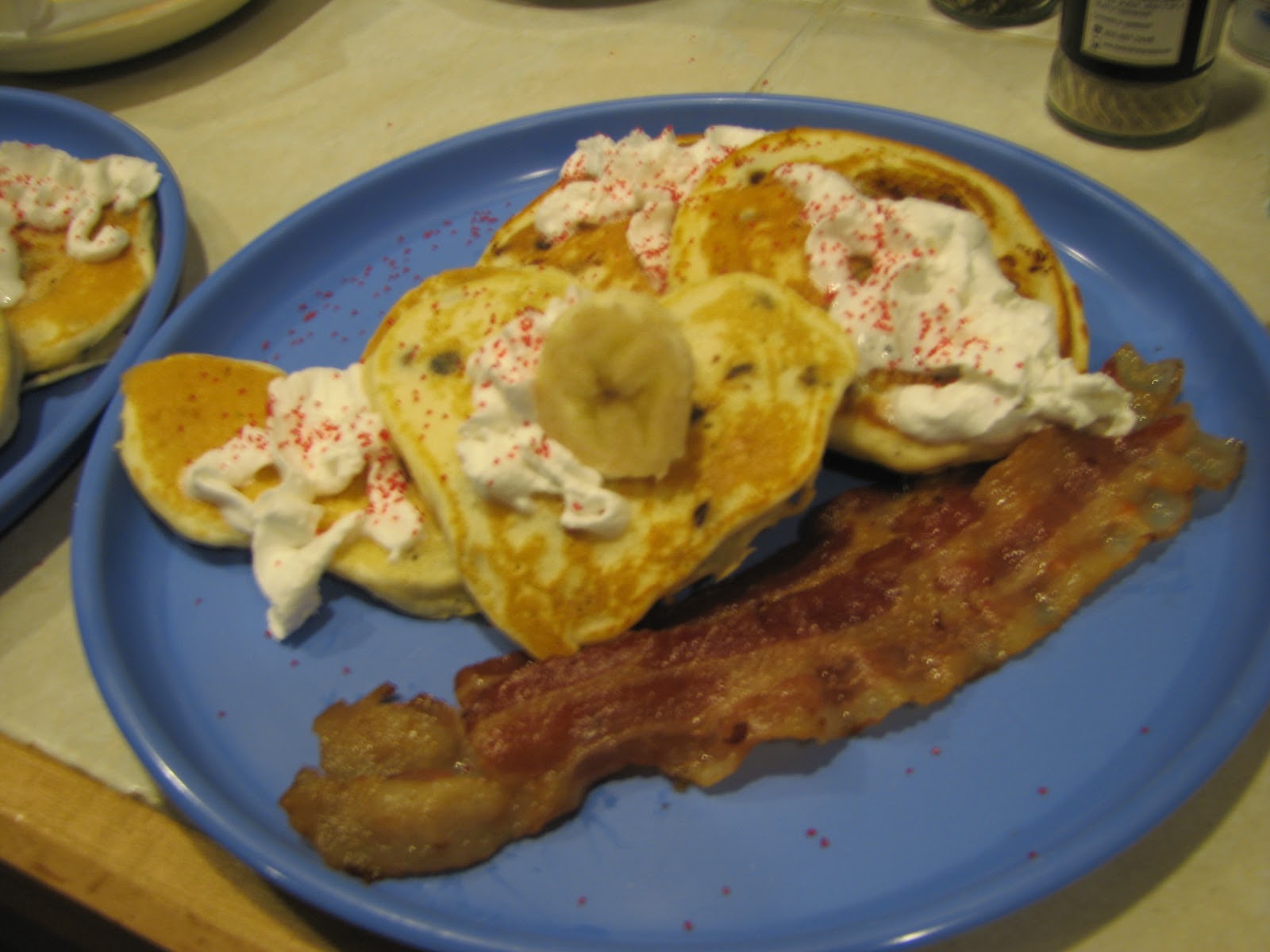 After school let out at noon, I had three kids high on sugar buzzing about the house. All that comes up, must come down. So, by the time that dinner was ready, the little guys were ready to crash and burn. However, the sight of heart shaped, banana chocolate chip pancakes with whip cream and sprinkles, bacon, and sparkling apple cider was more than enough to perk them up. Which was good, because the evening was just starting!
